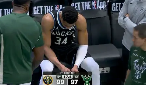 第四节比赛,字母哥在替补席神情落寞,脚部已被缠上厚厚绑带。